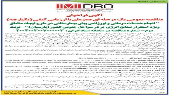 آگهی فراخوان مناقصه عمومی یک مرحله ای همزمان با ارزیابی کیفی ( یکپارچه ) انجام خدمات درمانی و اورژانس پیش بیمارستانی در طرح ایجادمناطق ویژه استقرار صنایع انرژی بر در سواحل جنوبی کشور* *( پارسیان ) _ نوبت دوم_ گروه خبری : گروه های مطالب,آخرین اخبار,اخبار برگزیده کد خبر : 297 کلمات کلیدی