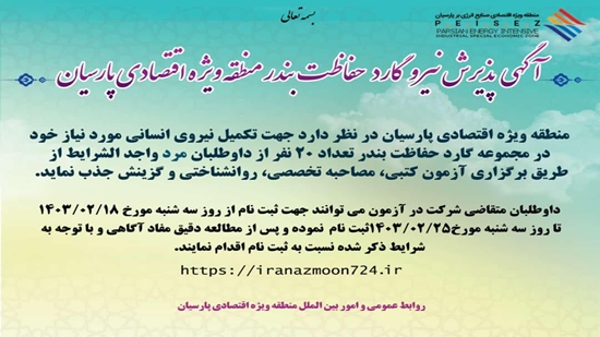 آگهی پذیرش نیرو جهت گارد حفاظت بندر منطقه ویژه اقتصادی پارسیان از طریق شرکت های برون سپاری تامین نیروی انسانی
