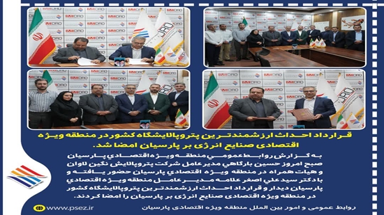 قرارداد احداث ارزشمندترین پتروپالایشگاه کشور در منطقه ویژه اقتصادی صنایع انرژی بر پارسیان امضا شد.