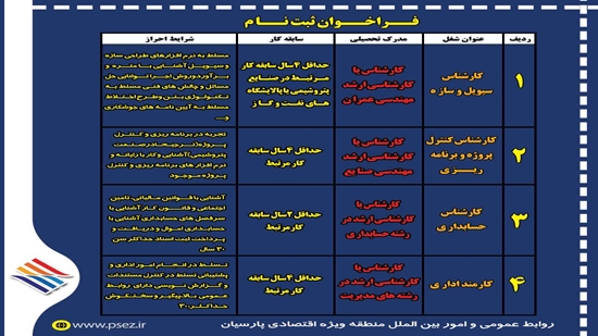به گزارش روابط عمومی منطقه ویژه اقتصادی پارسیان؛ در راستاى بکارگیرى افراد بومى در سطح شرکت هاى پتروشیمی مستقر در منطقه ویژه اقتصادى پارسیان از واجدین شرایط با تخصص های ذیل ثبت نام به عمل می آید.